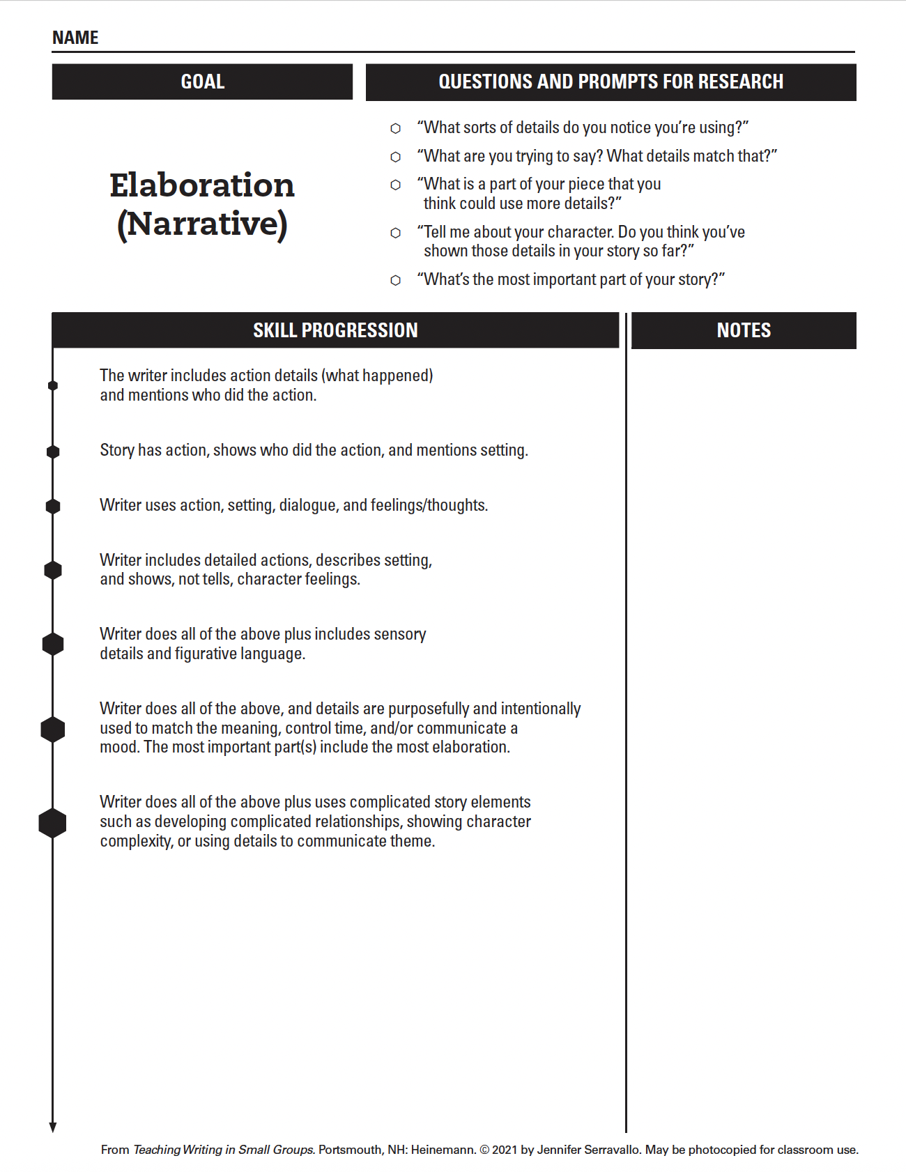 For instance, a student working on elaboration in narrative writing might progress from adding